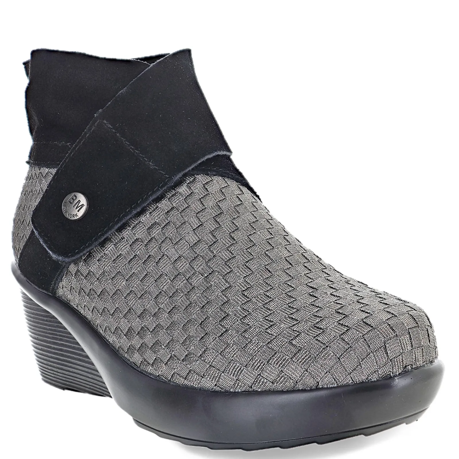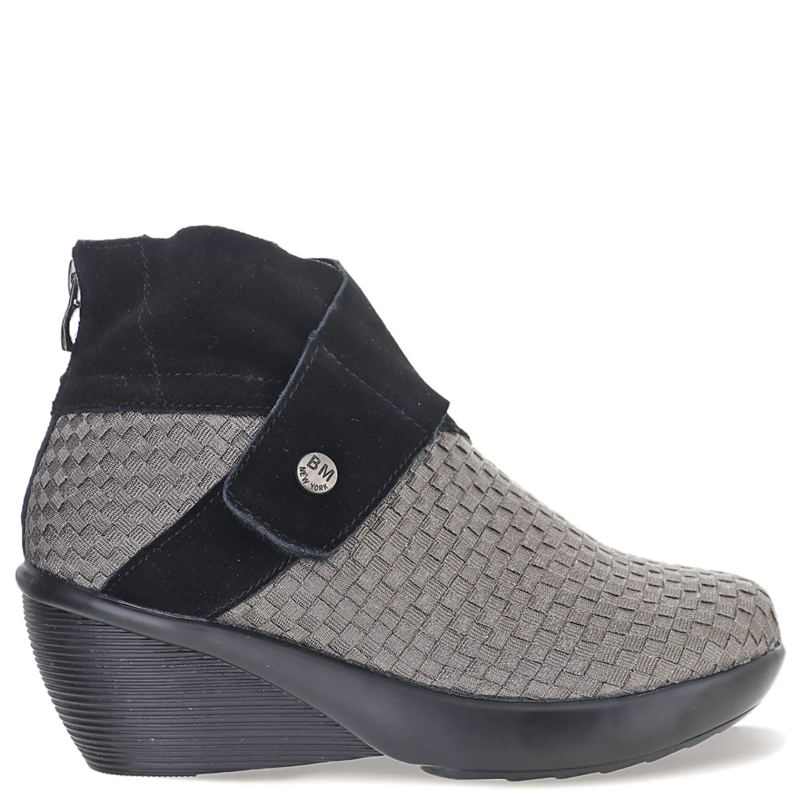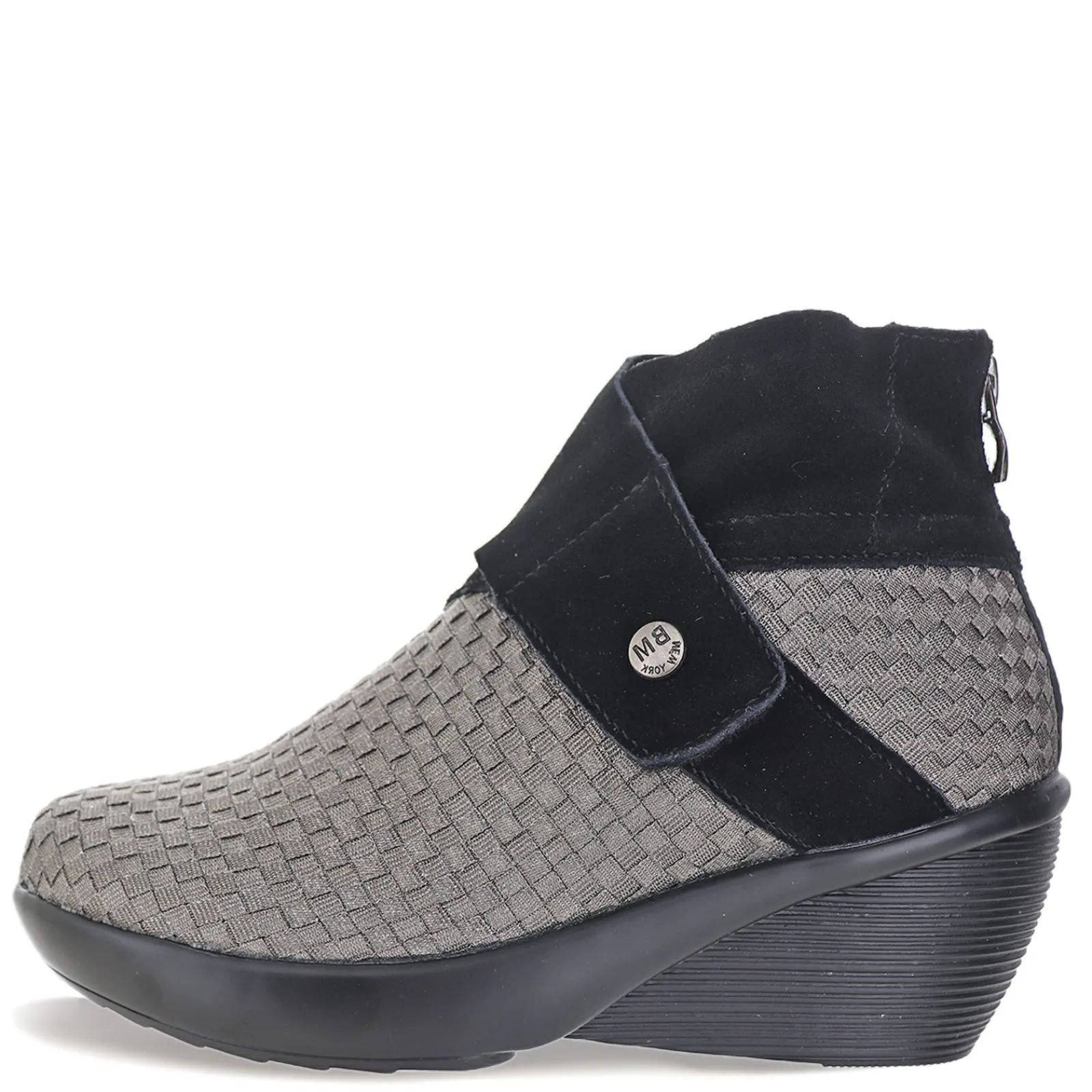 Women’s Bernie Mev, Jacqueline Bootie. Add some edge to your outfit with the Bernie Mev Jacqueline wedge bootie. This style is crafted with woven elastic and suede uppers, featuring a zipper closure at back. The padded insole provides all-day comfort while the wedge midsole gives you added lift. Rubber outsole ensures long-lasting wear.