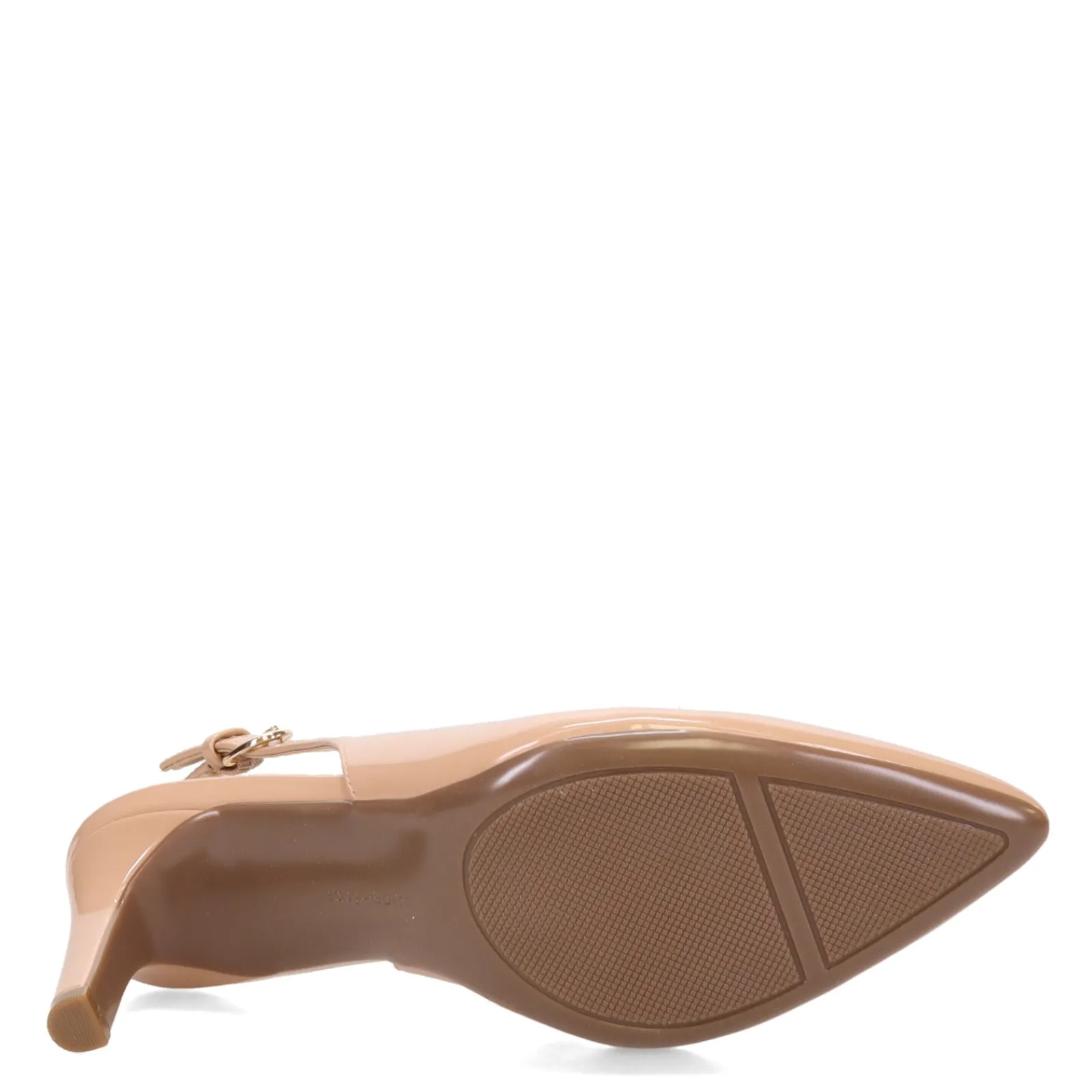 - Faux leather or patent upper in a high heel stiletto slingback pump style