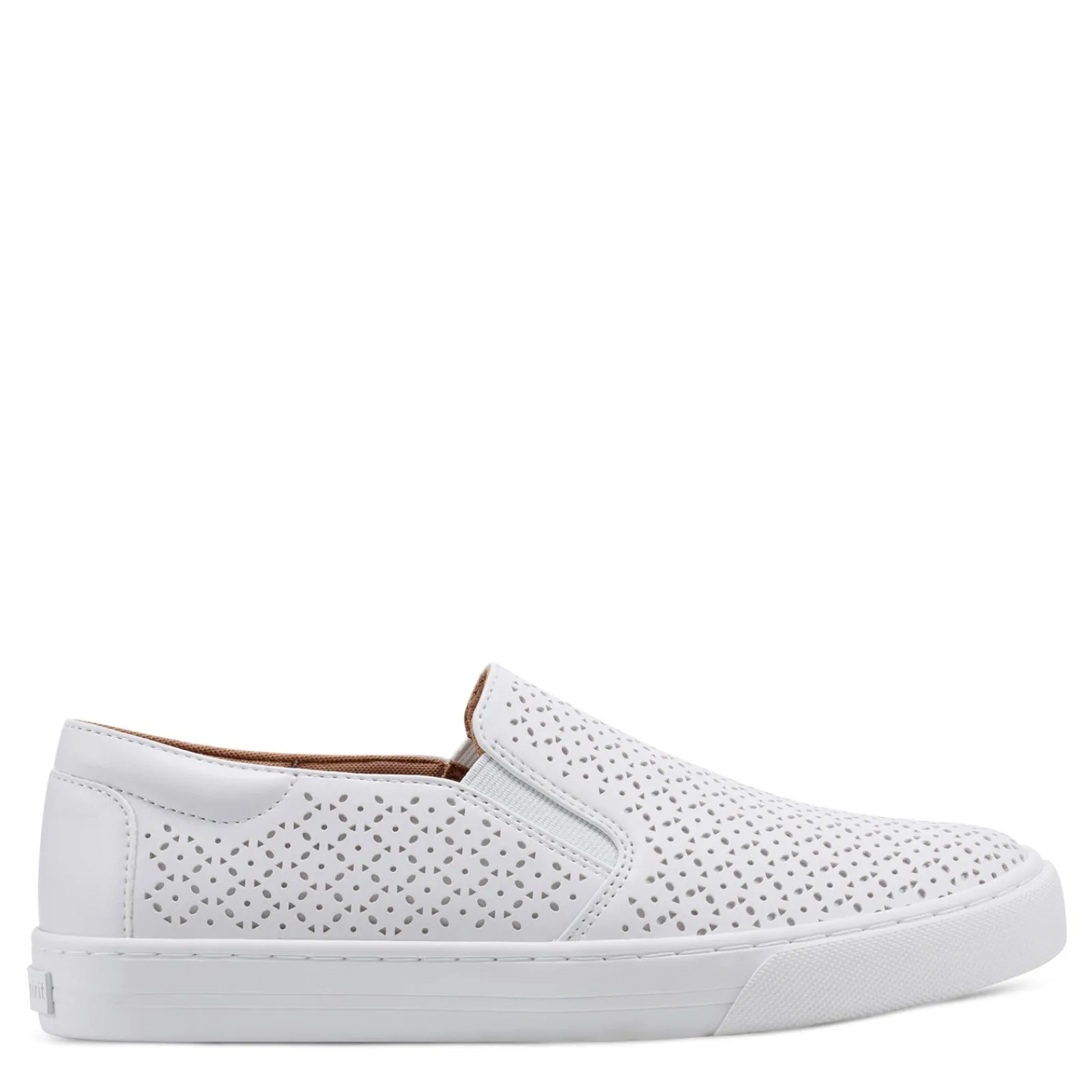 - Laser cut faux leather and stretch fabric upper in a slip-on sneaker style