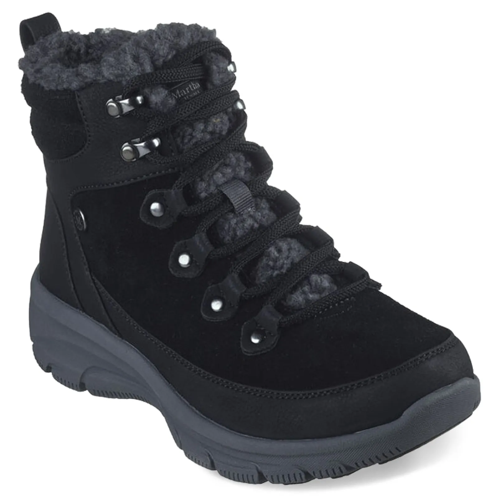 Step into winter with style and comfort with the Skechers x Martha Stewart: Easy Going – Winter Road boot. Embrace the winter season with confidence and stride with ease. Suede uppers with a cushioned knit collar. Lace up style boot featuring a sherpa tongue and lining. Plush Air-Cooled Memory Foam insole that provides cushioning and support for all-day wear. Shock-absorbing cushioned midsole ensures optimal comfort with each step. 1 1/4 inch heel height with a flexible traction outsole