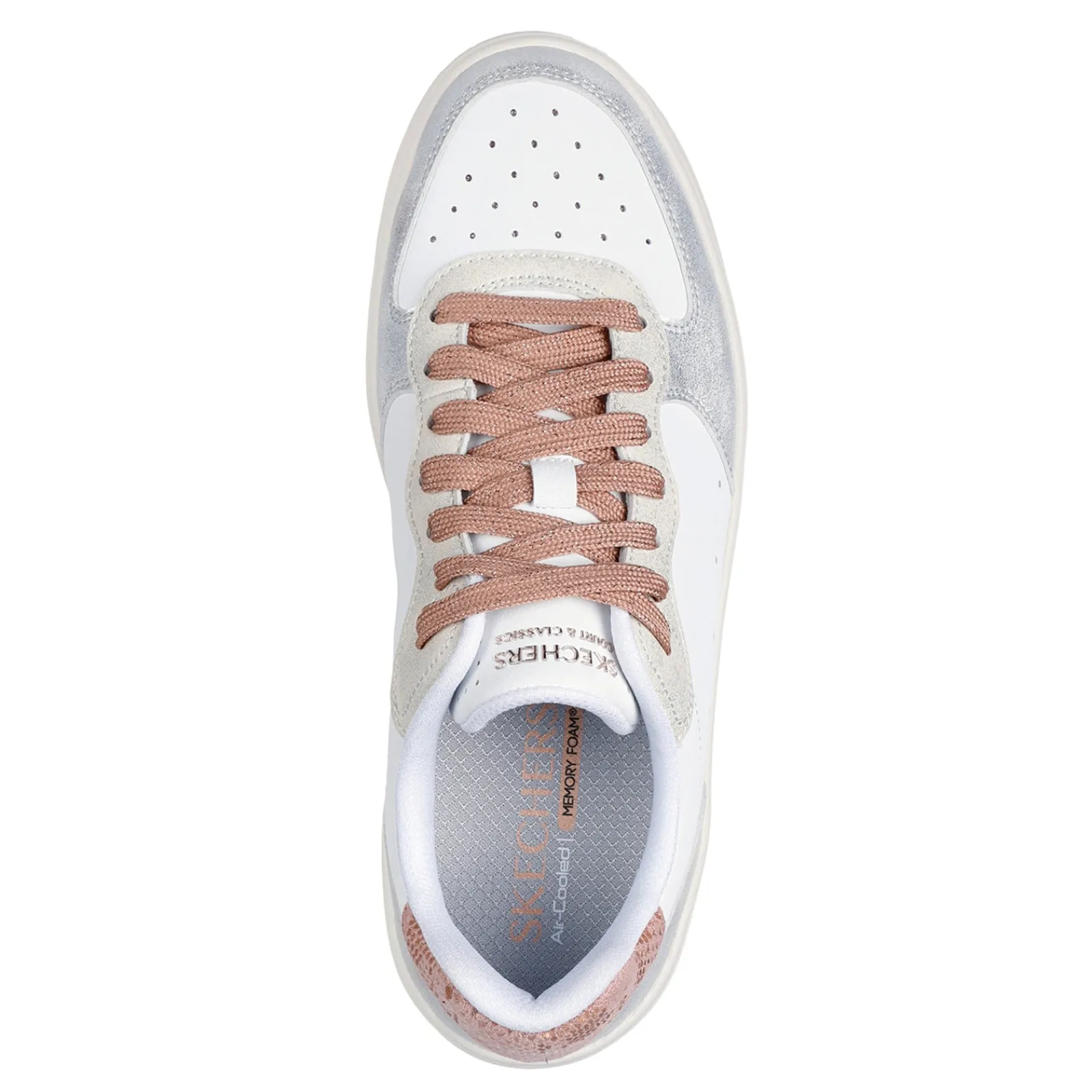 Skechers Hiland – Soft Metals blends classic charm with contemporary flair, featuring a stylish lace-up design crafted from duraleather with shimmering metallic overlays. With a cushioned Skechers Air-Cooled Memory Foam insole and a discreet hidden wedge, these sneakers offer both eye-catching elegance and all-day comfort.