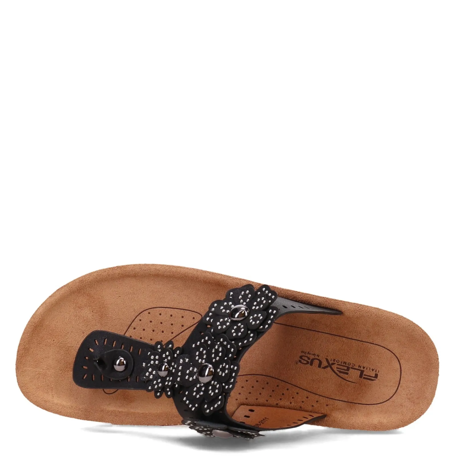 Women’s Flexus, Bayview Sandal. The Bayview thong sandal features feather light flexible outsole, soft microsuede lining and pretty layered flower petal embellishments, plus stud details on the straps. With a molded EVA footbed wrapped in soft microsuede, experience what it feels like to find your perfect fit.
