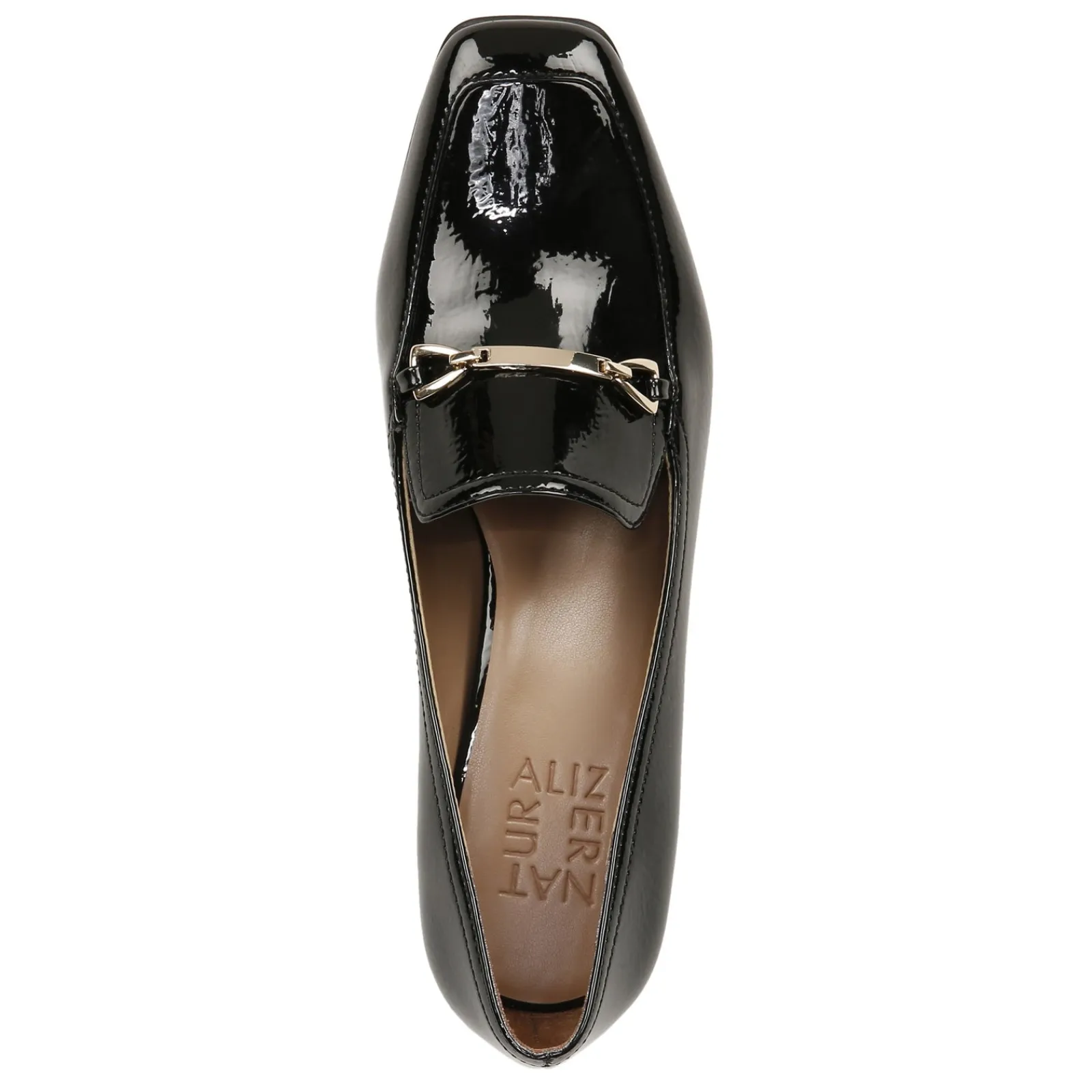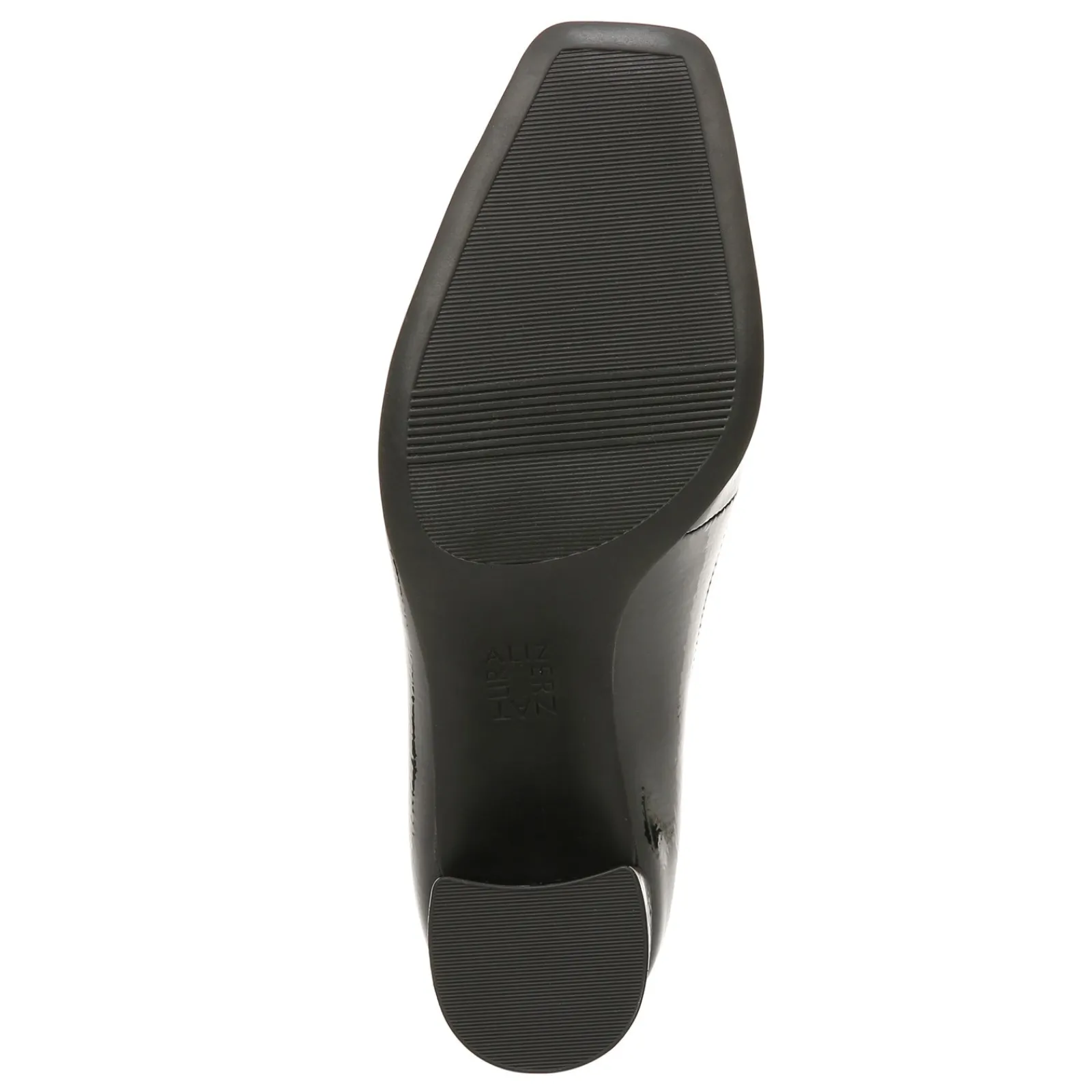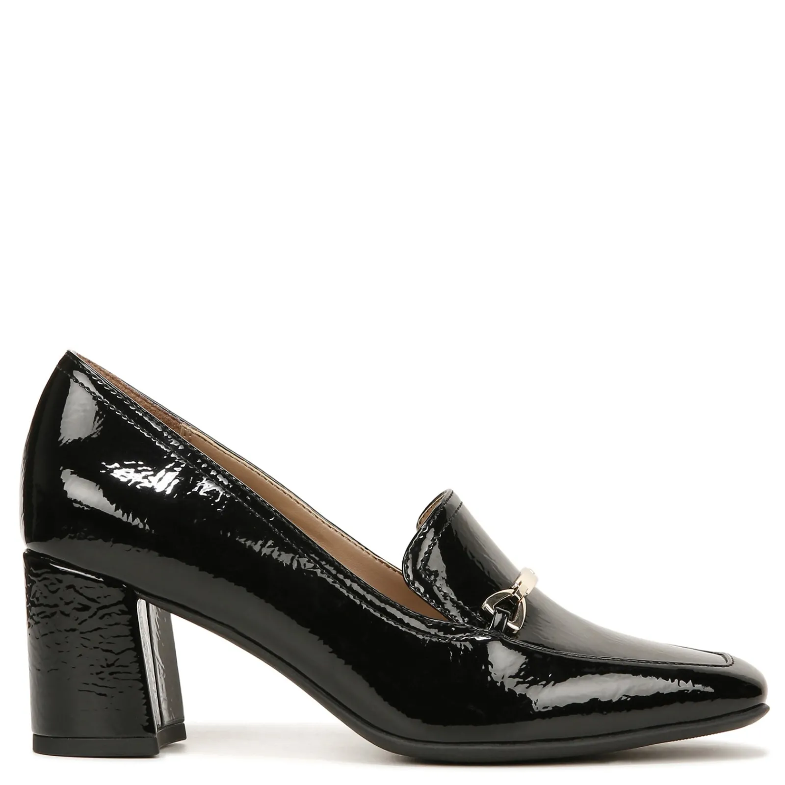 Make a fashion statement in this sleek block heel pump complete with polished metal bit ornamentation and square shaped toe. Dress in comfort with a cushioned insole, soft lining and flexible sole.