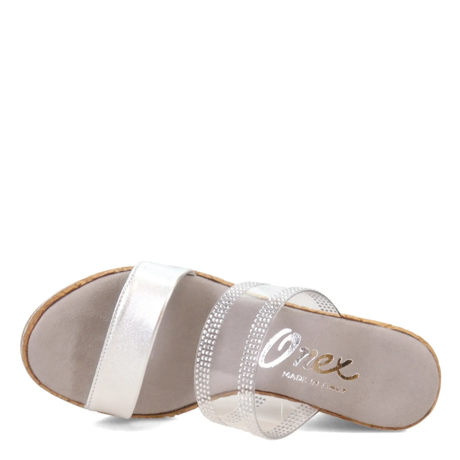 This trendsetting wedge is adorned with sparkling rhinestones and comes with a clear vinyl upper band. Pair it with jeans or a flowy skirt to make a statement that lasts.