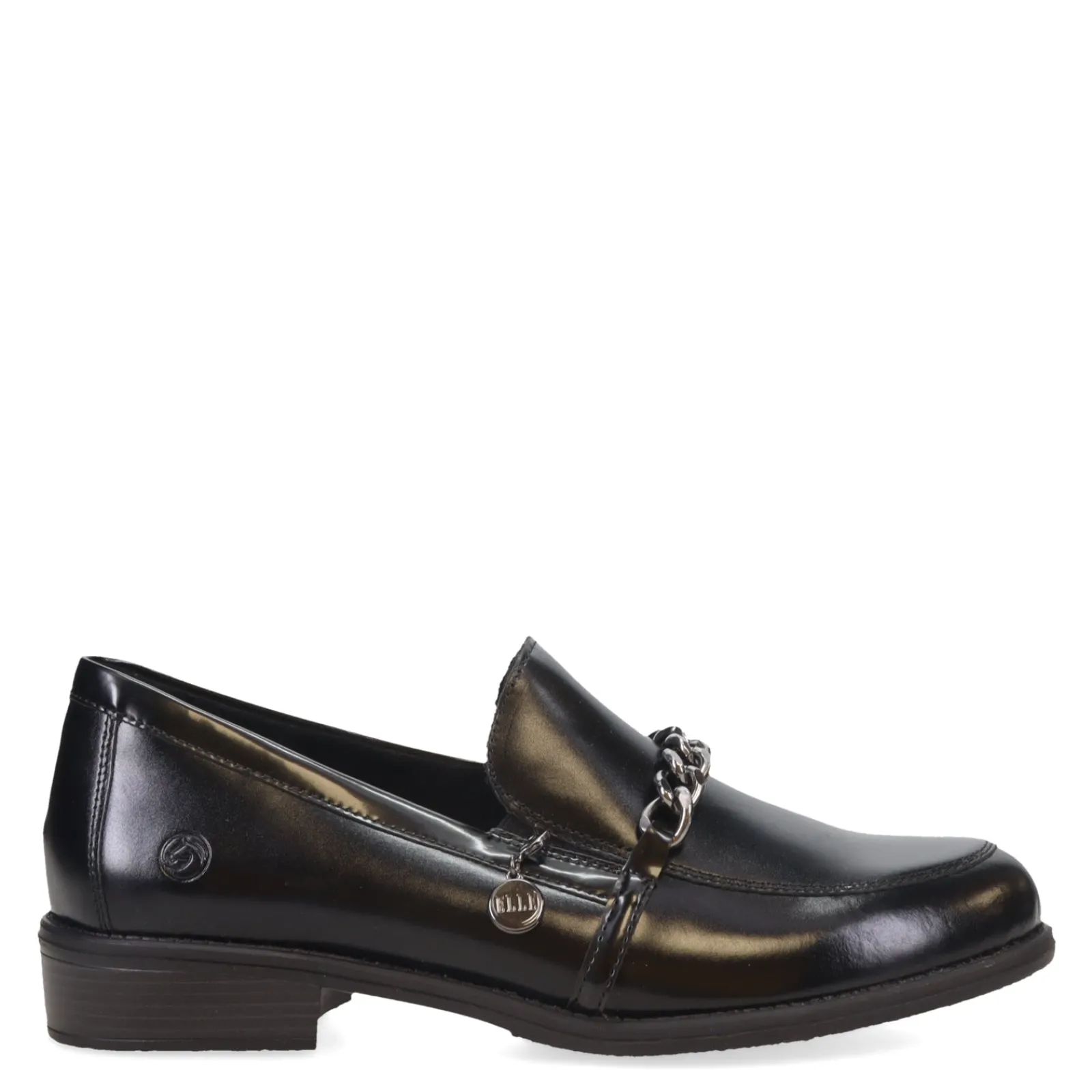 - Leather uppers with decorative chain accent