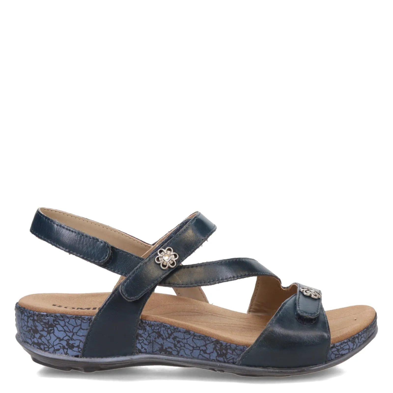 Women’s Romika, Fidschi 54 Sandal. Enjoy the warmer weather in these fashionable low heel sandals. This feminine design features a strappy leather upper with printed midsole and decorative floral button accents.