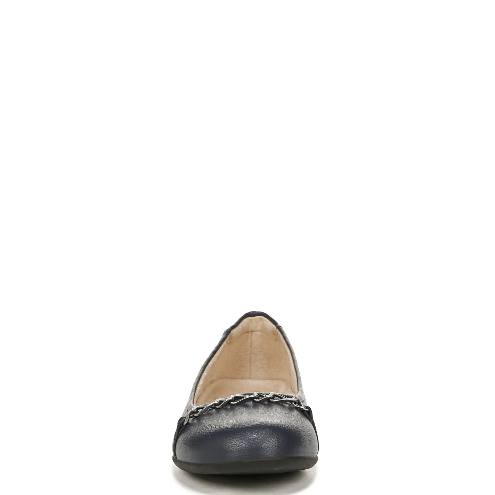 These faux leather ballet flats offer a feminine look that’s comfortable enough to wear all day. With an elegant chain trim and cushioned memory foam footbed, this versatile style features sleek modern lines and sophisticated style paired with total comfort Smooth manmade uppers featuring chain accent for added appeal Slip on style for an easy on and off Fabric linings All Thru Comfort padded memory foam footbed with arch support for added comfort Manmade outsole