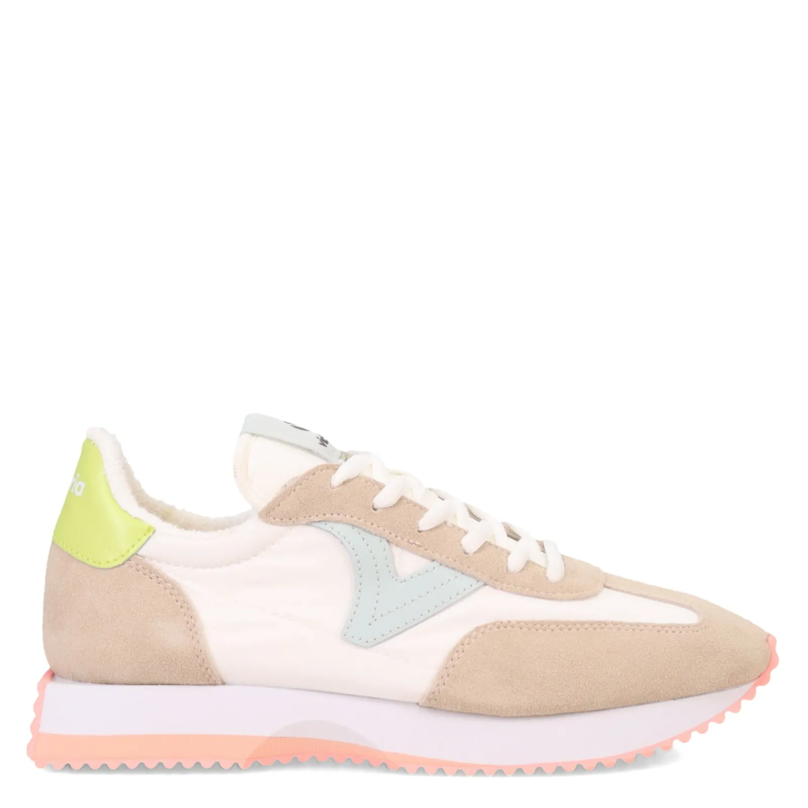 Introducing the Victoria Cosmos Sneakers, a stylish blend of retro design and modern comfort crafted from nylon and split leather overlay panels. With neon detailing on the sole and back, along with a retro V on the side and white lace fastening, these sneakers offer both eye-catching style and lightweight functionality.
